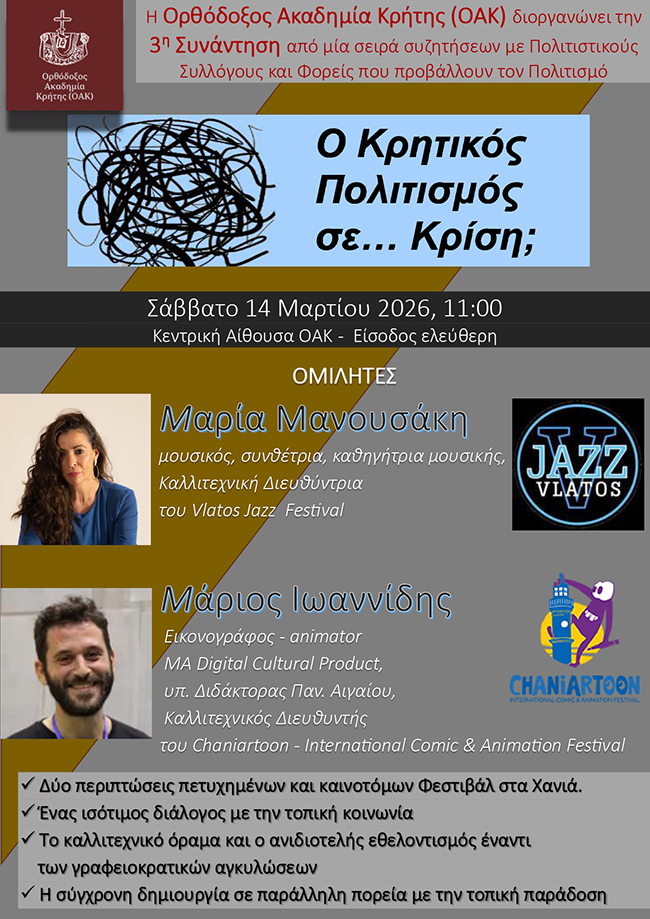 Για όλα τα παραπάνω, η Ορθόδοξη Ακαδημία Κρήτης (ΟΑΚ) διοργανώνει σειρά συζητήσεων, με θέμα «Ο Κρητικός Πολιτισμός σε… Κρίση;». Παράλληλα, κάνει ανοικτό κάλεσμα στους Πολιτιστικούς Συλλόγους και σε κάθε Φορέα που προβάλλει τον Πολιτισμό του τόπου μας, όπως και σε κάθε ιδιώτη που ενδιαφέρεται να ενημερωθεί.