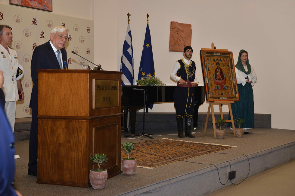 Όπως χαρακτηριστικά δήλωσε ο κ. Παυλόπουλος: «Κλείνω, αναλογιζόμενος και αναγνωρίζοντας, ειλικρινώς και ευθαρσώς –όπως κάνει, άλλωστε, και η συντριπτική πλειοψηφία του Λαού μας– την καθοριστική συμβολή της Ορθόδοξης Εκκλησίας στους μεγάλους Αγώνες του Λαού μας και του Έθνους μας. Συνακόλουθα δε την καθοριστική συμβολή της στην υπεράσπιση της Ιστορίας μας και της Πατρίδας μας. Το Εθνικό, κυριολεκτικώς, τούτο χρέος οφείλουμε να το εκπληρώνουμε με συνέπεια πολύ περισσότερο σήμερα, ενόψει των μεγάλων προκλήσεων που βρίσκονται μπροστά μας, και οι οποίες θα καθορίσουν, τελικώς, την ευόδωση του Ιστορικού μας προορισμού. Η Ορθόδοξος Ακαδημία Κρήτης το πράττει στο ακέραιο και της είμαστε όλοι οι Έλληνες ευγνώμονες γι’ αυτό. Έχω αίσθηση του καθήκοντός μου και της ιστορικής μου ευθύνης να υποστηρίξω ολόψυχα και με όλες μου τις δυνάμεις το λαμπρό έργο που επιτελεί».