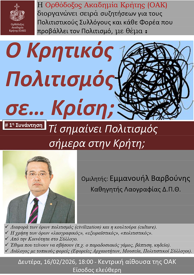 H Ορθόδοξος Ακαδημία Κρήτης (ΟΑΚ) διοργανώνει μία σειρά συζητήσεων, με κεντρικό θέμα: «Ο Κρητικός Πολιτισμός σε… Κρίση;». Παράλληλα, κάνει ανοικτό κάλεσμα προς όλους τους Πολιτιστικούς Συλλόγους και σε κάθε Φορέα που προβάλλει τον Πολιτισμό του τόπου μας, όπως και σε κάθε ιδιώτη που ενδιαφέρεται να συμβάλει στο διάλογο αυτό, τόσο αναγκαίο για το μέλλον της κρητικής παράδοσης.